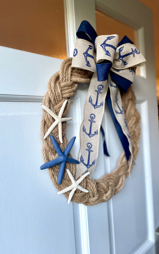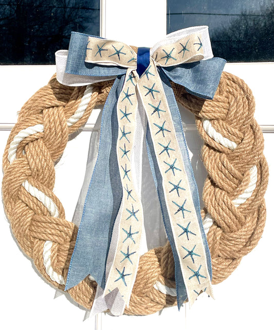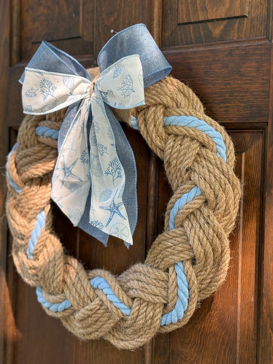 18” White Cotton Rope Wreath w/ blue ship wheel accent