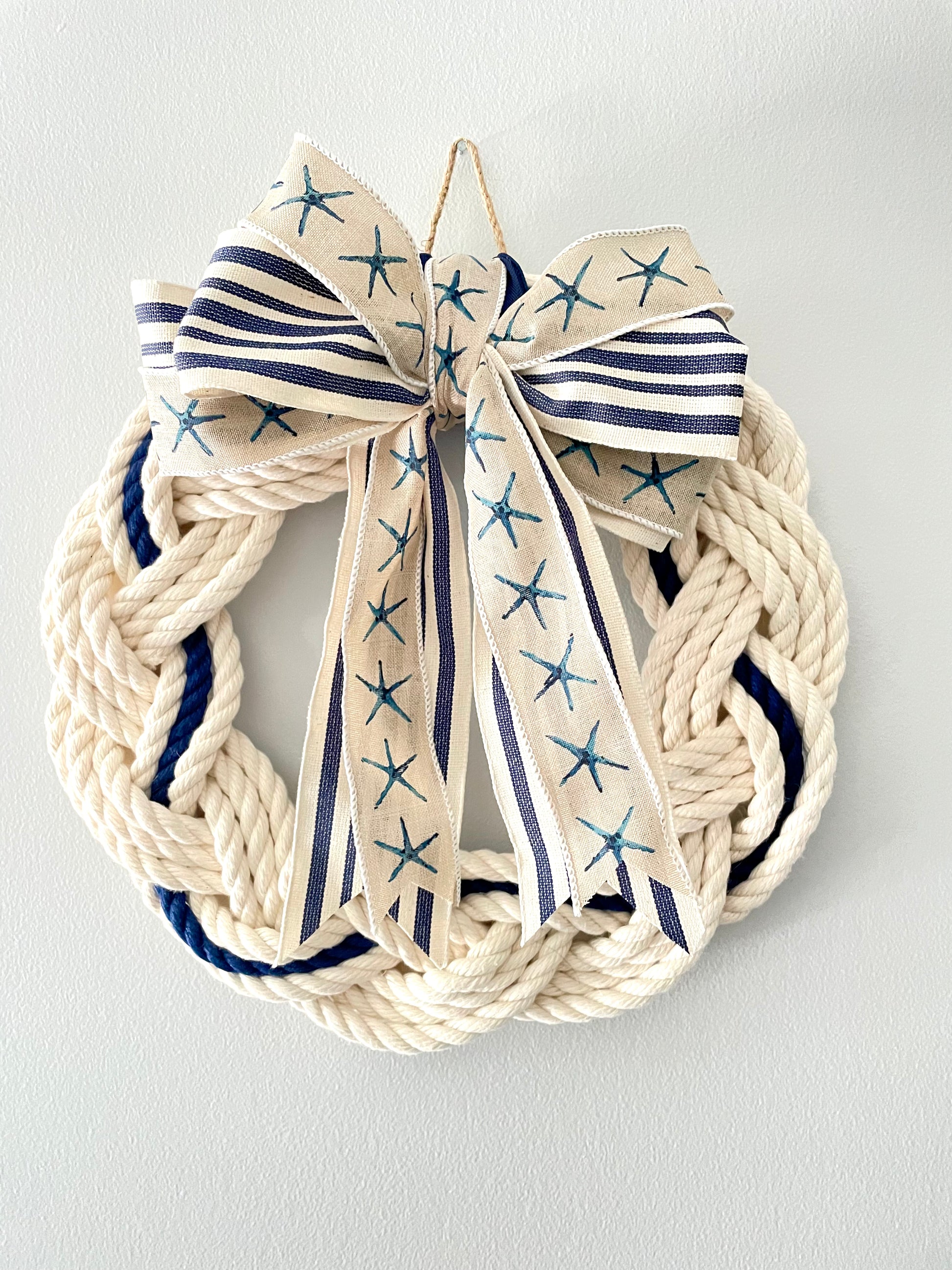 Named after the best beach in Scituate, Ma. Welcome guests to your home with this 13" White with Navy Braided Rope Wreath. Adorned with a starfish and striped bow, this wreath brings a charming nautical touch to any door or wall. Made from durable materials, it can withstand the elements for long-lasting use.
