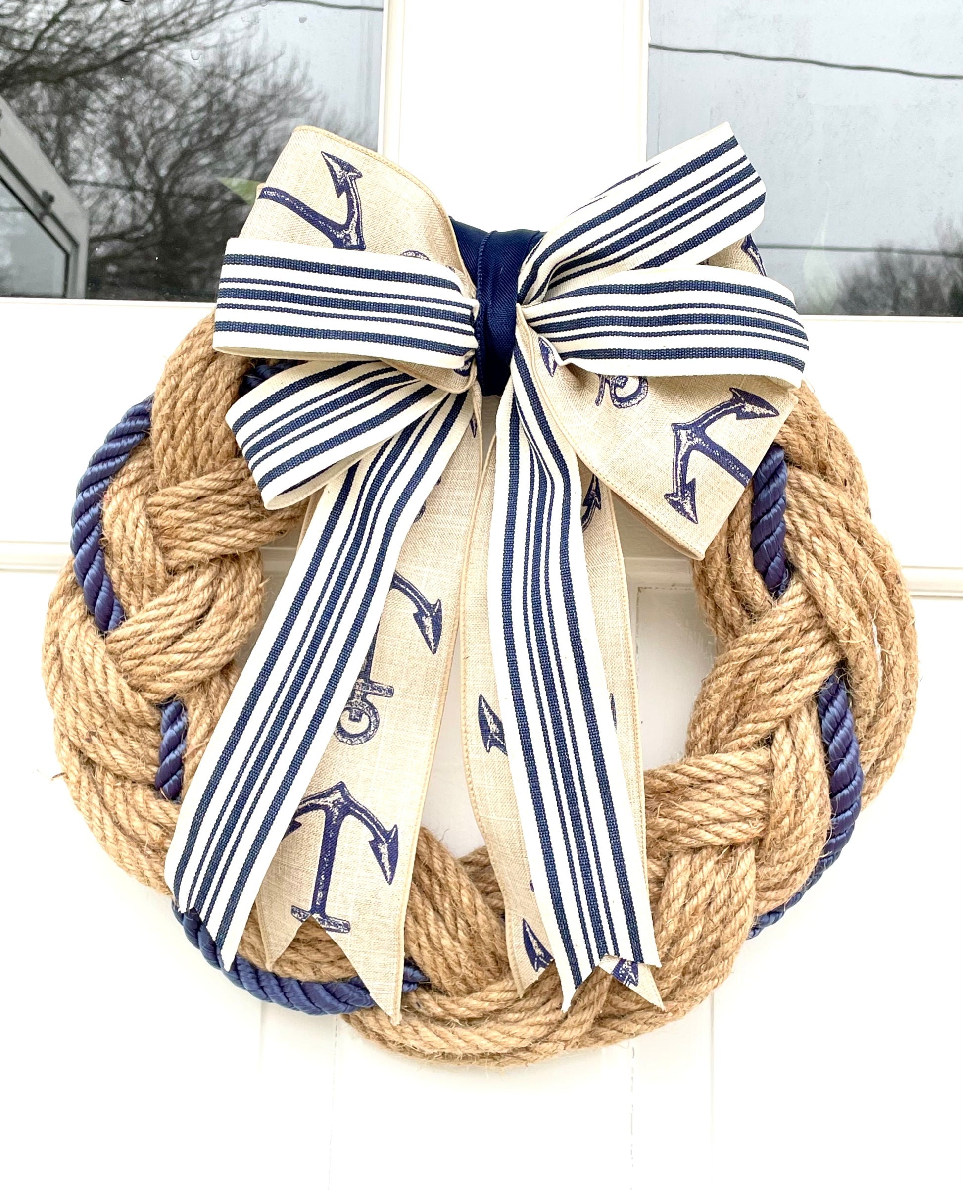 Named after Madaket Beach on Nantucket. Best place to see the sunset! This 13" nautical braided jute wreath features a navy blue nylon boat rope accent, adding a touch of coastal charm to any space. Handcrafted with durable materials, it is the perfect addition to your home or office decor. Elevate your nautical theme with this beautiful wreath.