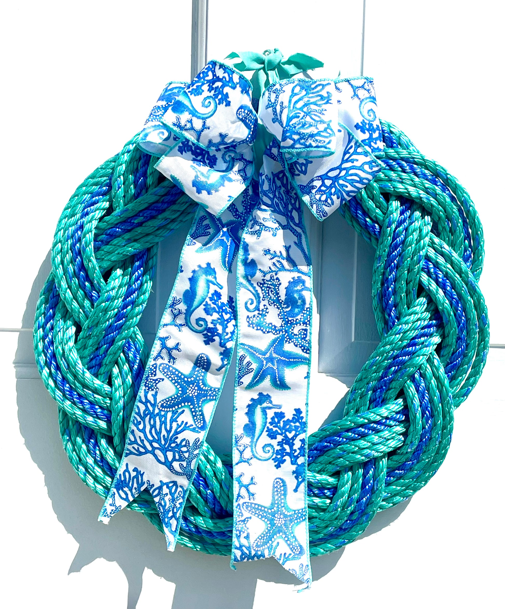 This 16” Blue and Green Lobster Rope Wreath is perfect for adding a touch of nautical charm to your coastal boating or beach house decor. Made from durable materials, it is designed to withstand the summer elements and last for years to come. A must-have for any seaside or ocean-inspired space.