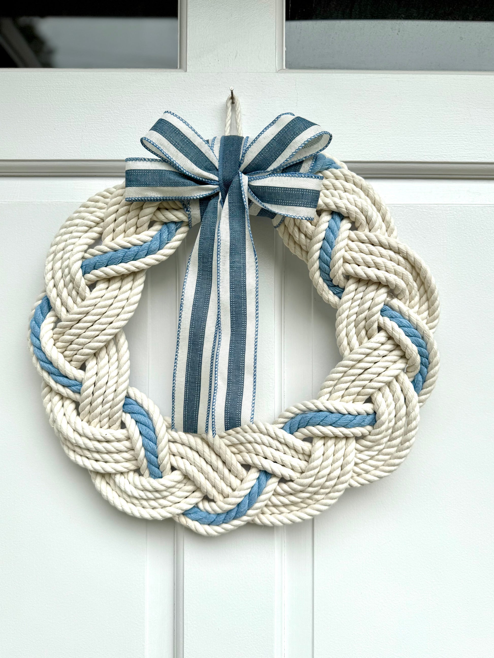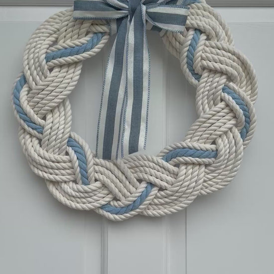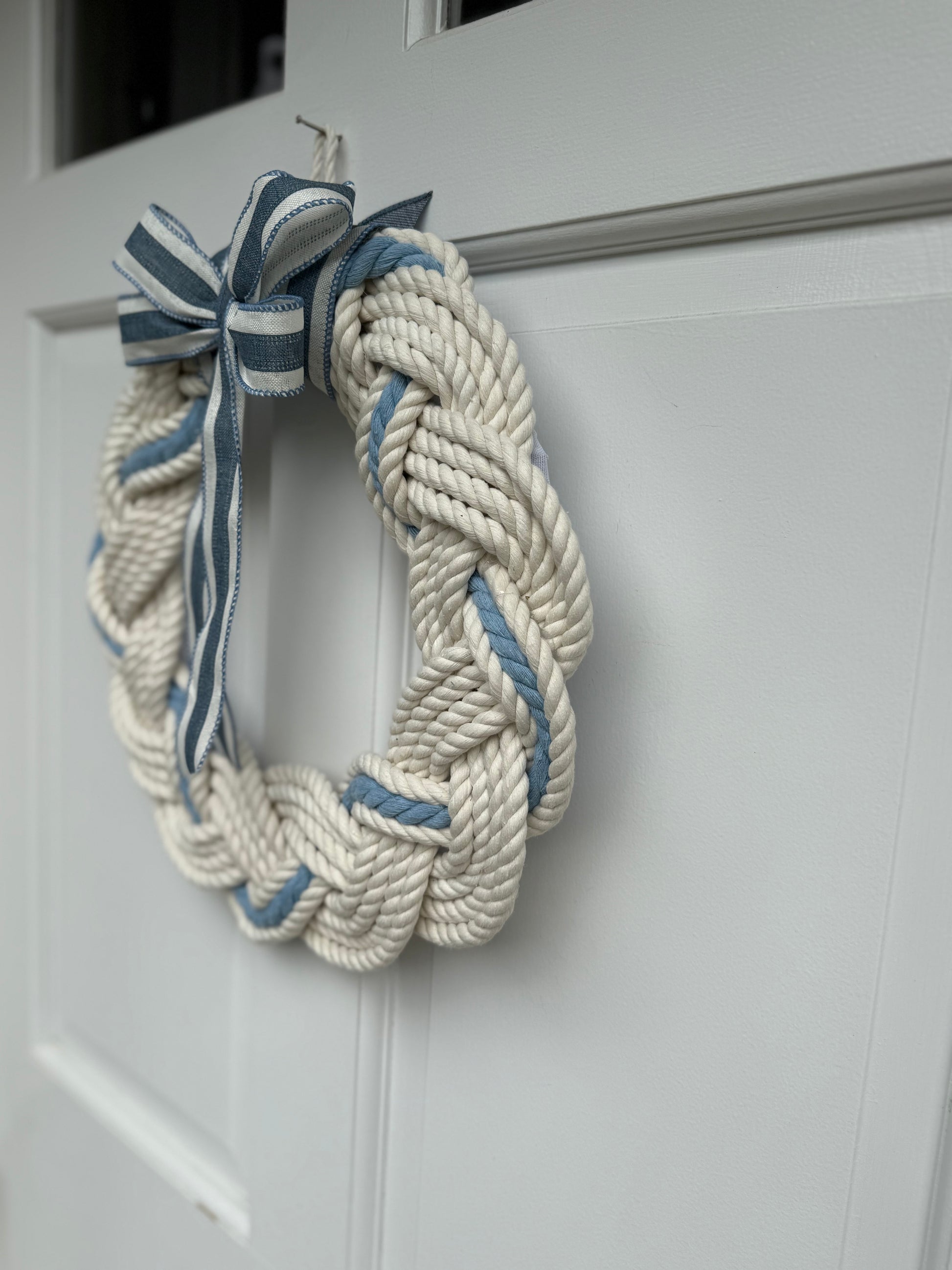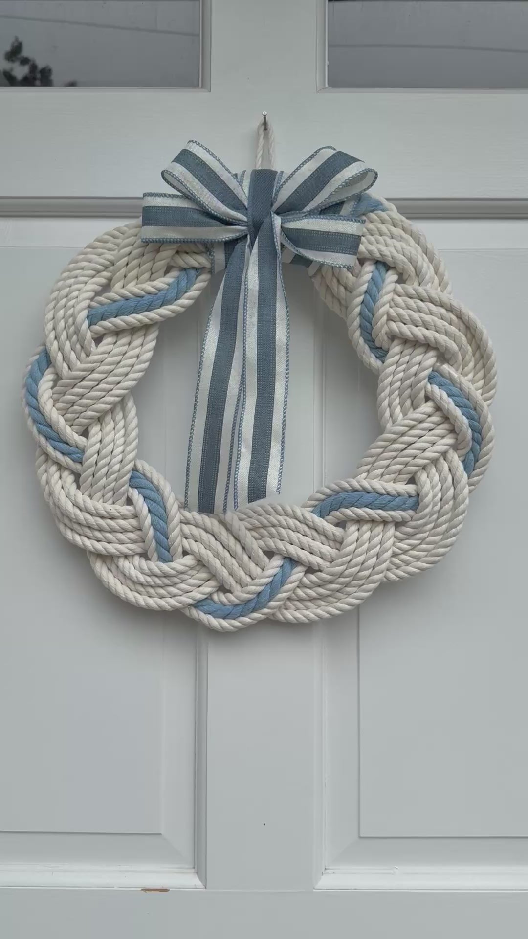 Named after a private beach by the yacht club in my hometown of Scituate, Ma. This 16" light blue and white rope wreath is a versatile and stylish addition to any home decor. Crafted with durable materials, this wreath is perfect for both indoor and outdoor use. Its elegant design adds a touch of sophistication to any space, making it a must-have for any season.