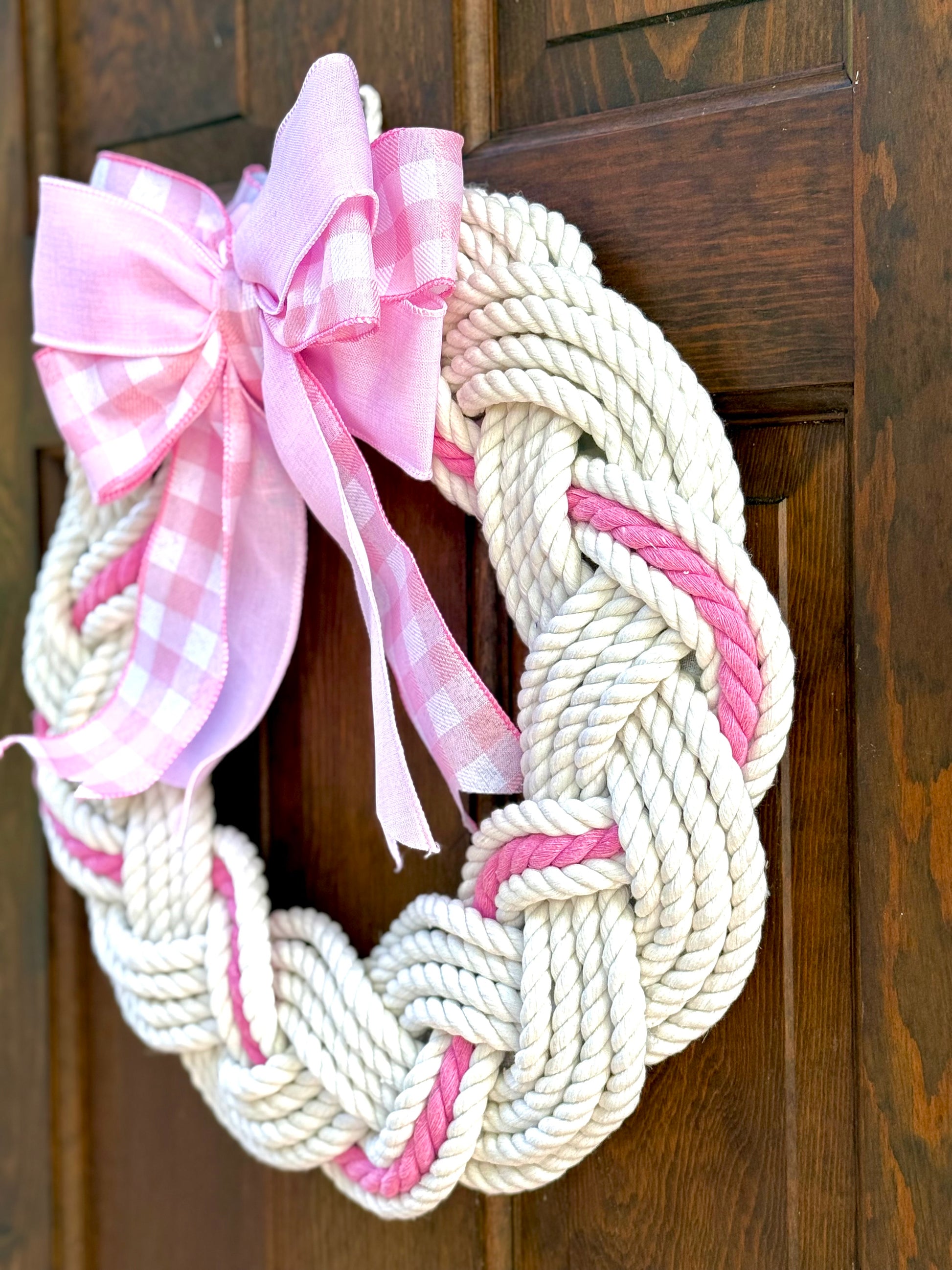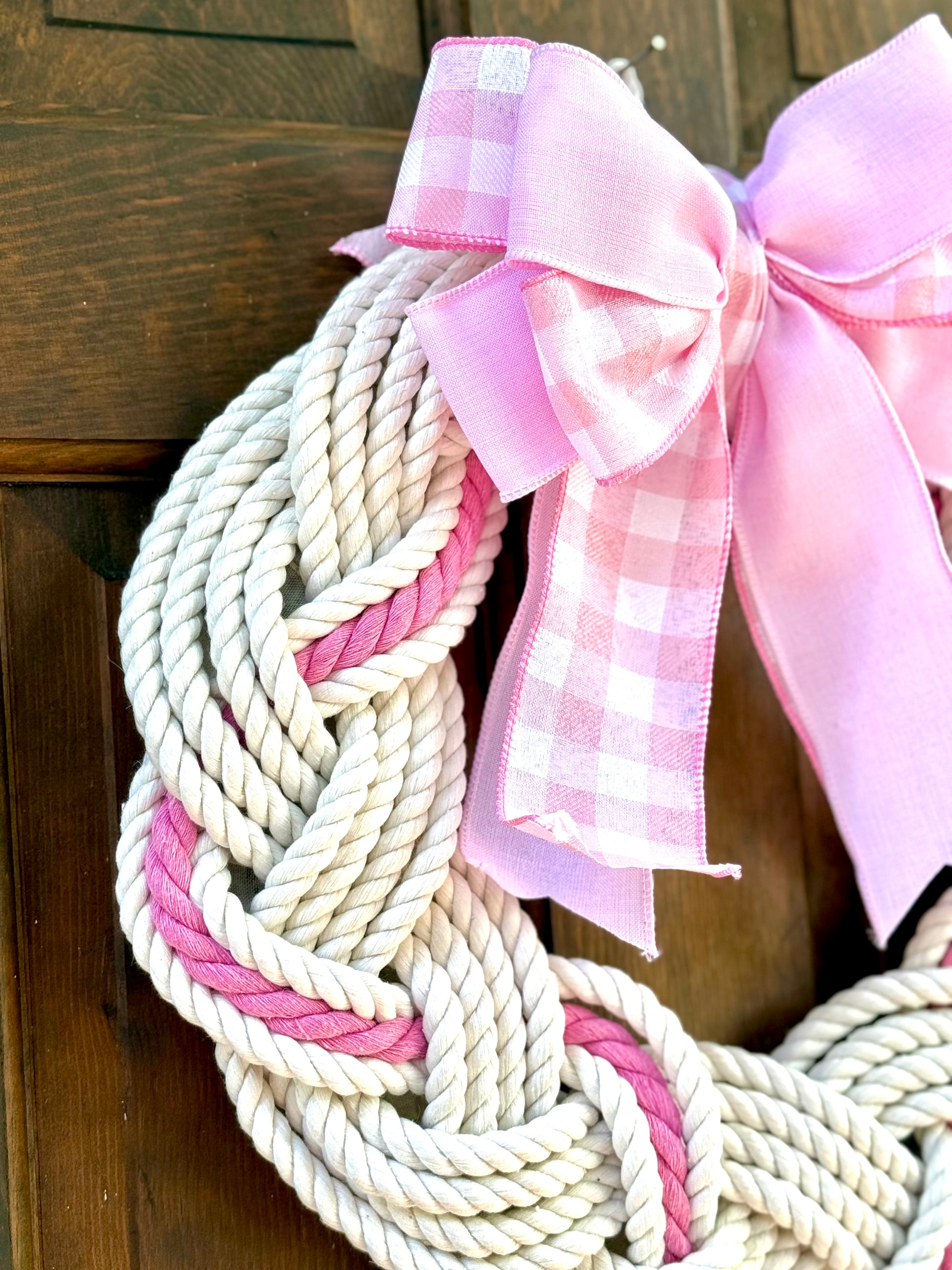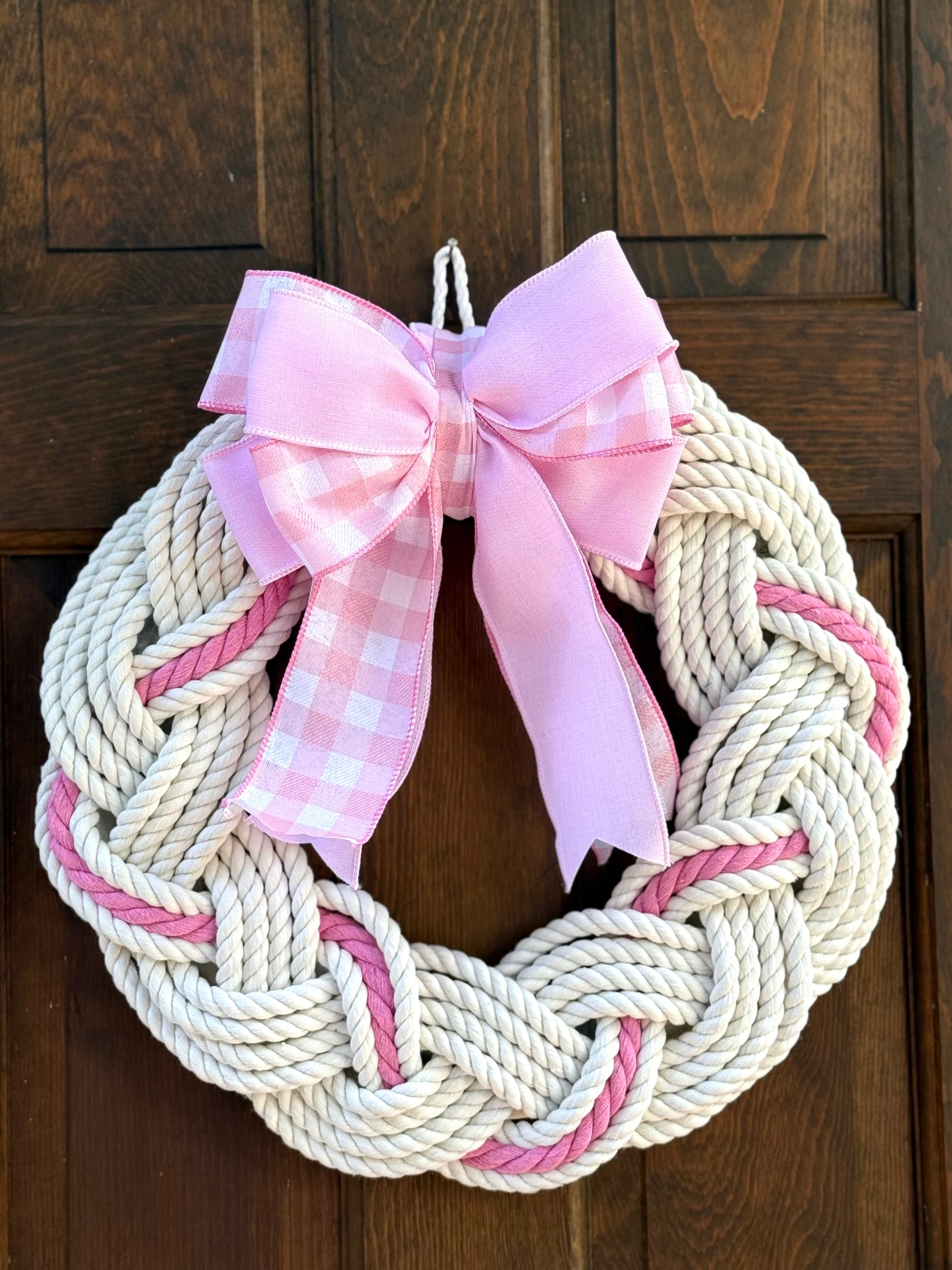 Named after a lovely beach on Nantucket Island. This 16" Pink and White Rope Wreath is perfect for year-round use and makes a great gift. Its durable construction ensures long-lasting beauty, and it can be custom-made to fit any size space. Add a touch of charm and elegance to any room with this lovely wreath.