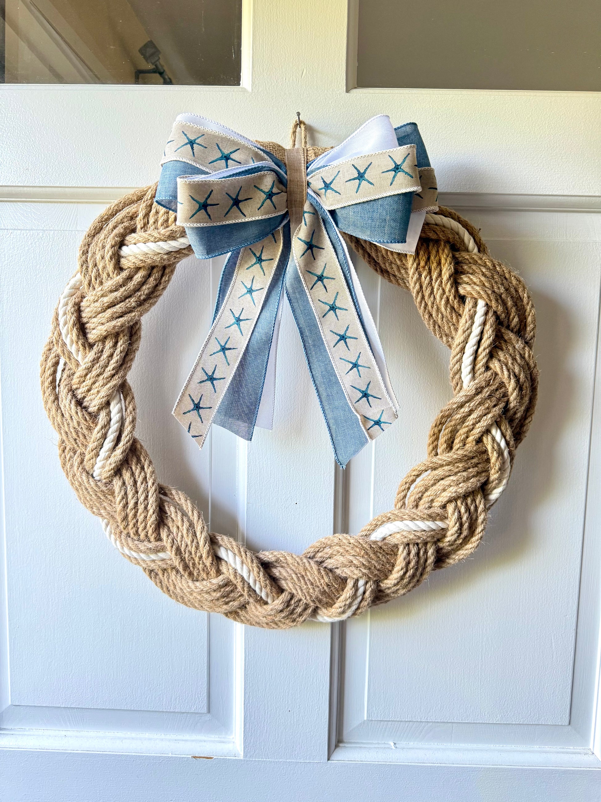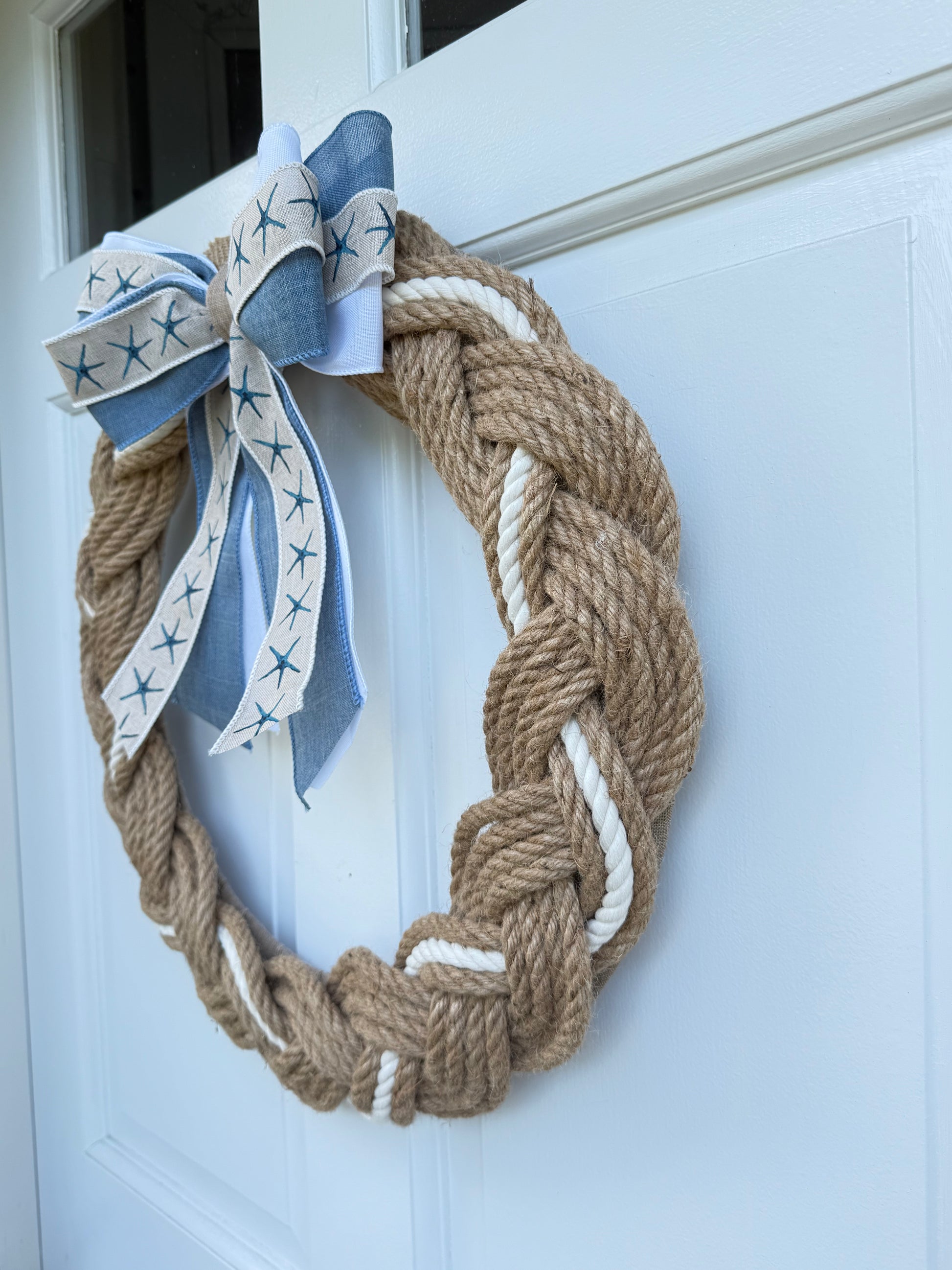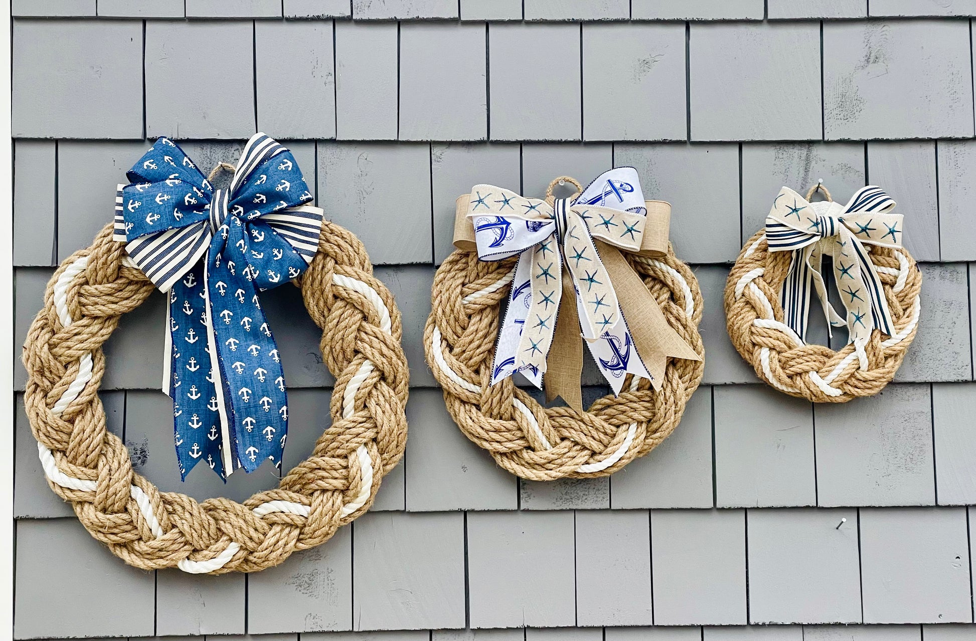 One of our best selling wreaths is named after a beach on Martha’s Vineyard. This popular 18" wreath combines the rustic charm of braided jute with the durability of boat rope for a nautical touch. Adorned with a beautiful bow, it's perfect for adding a coastal feel to any space. Perfect house warming or Mother’s Day gift.
