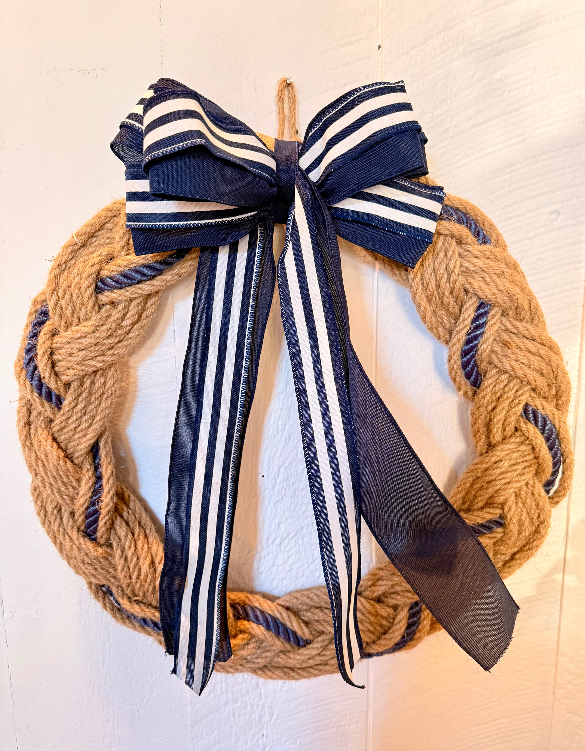 This wreath is named after one of Nantucket’s most popular beach. This 20" Jute and Navy Blue Boat Rope is perfect for adding a nautical touch to your beach house decor. The nautical ribbon with a touch of pink adds a subtle pop of color, while the sturdy jute material ensures durability. Elevate your nautical theme with this elegant and functional boat rope.